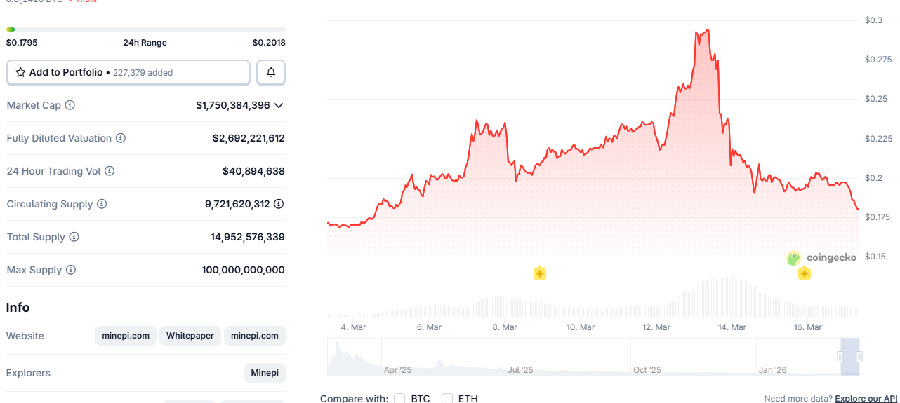Coincidentally (or not), this massive price drop was on Pi Day. After trying to rebound yesterday to over $0.20, PI has been rejected once more, and now sits at $0.18 after a 11% daily decline. Its market cap has fallen to $1.750 billion, making it the 50th-largest cryptocurrency by that metric. Just a few days ago, PI had entered the top 40 on CoinGecko.