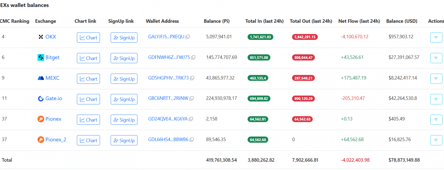 As of this writing, the total amount of PI stored on exchanges equals roughly 419.7 million. Over 50% of those are situated on Gate.io, whereas Bitget comes in second with 145.7 million.