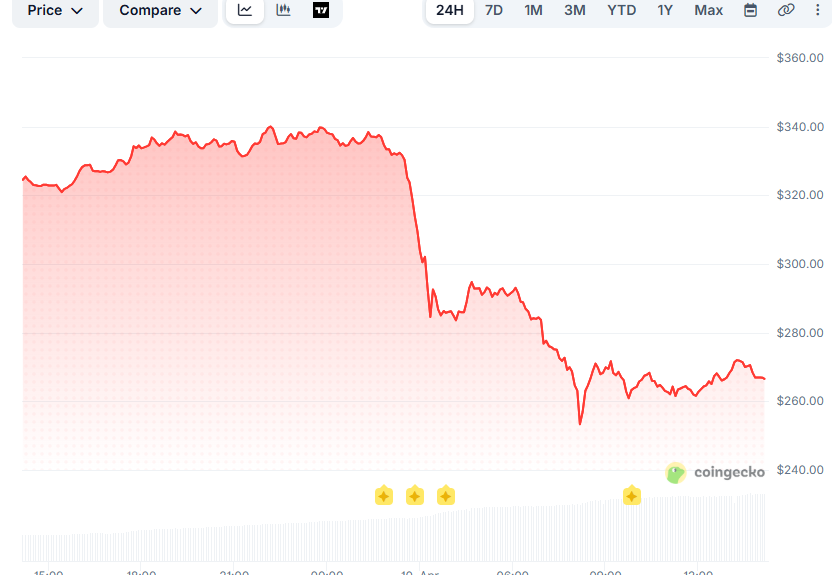 TAO is the worst-performing cryptocurrency (at least in the top 100) today, with its valuation briefly sinking to $253, the lowest since mid-March. Currently, it trades at around $263 (per CoinGecko), down 20% from yesterday’s figure. Its market capitalization fell to approximately $2.5 billion, and now TAO is the 38th-largest cryptocurrency.