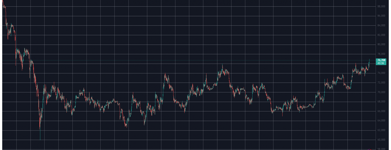 BTC reacted with an immediate price pump that drove it to almost $77,000 in minutes after Trump’s statement went live. The cryptocurrency last traded at such prices in early February, shortly before it plunged to a 1.5-year low of $60,000.