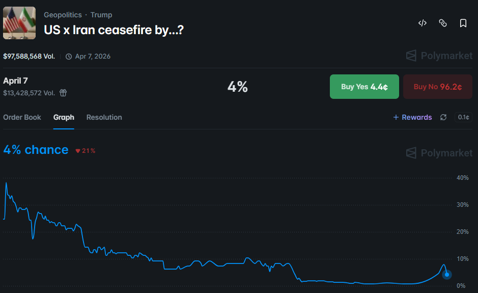 One of the most trending markets on Polymarket, with volume approaching $100 million, is the ceasefire between the US and Iran. There are multiple events users can speculate on, with the one with the closest expiry being on April 7th.